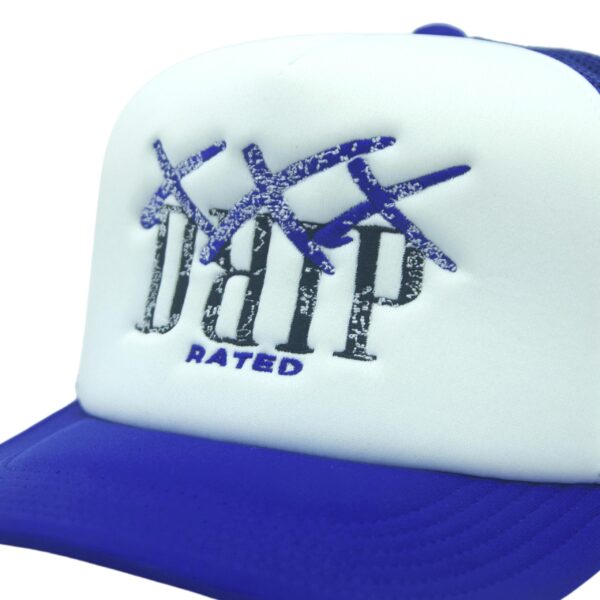 New Foam-fronted Blue XXX DRIP Baseball Cap (American 5 panel design). Made from a material mix of mesh fronted panels and breathable polyester for comfort, the pre-curved peak provides essential sun-visor coverage. The front construction is seamless with side-stitched mesh-backing providing essential rear ventilation. An excellent all-year round style choice allowing you to stay on-brand during at all other times.