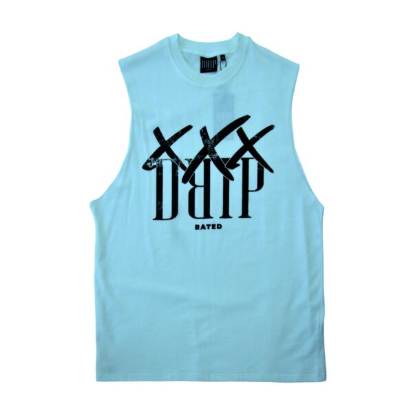 An ideal staple, low sided sleeveless baby blue t-shirt with small XXX DRIP Motif on reverse. Lose-fit, machine washable and a unisex fit. Made of 100% spun pre-shrunk cotton, it will ensure a very comfortable fit and breathable natural fabric. Made in the United Kingdom, you can be sure of a high quality fabric with a recommended wash temperature of 30 degrees . An excellent all-year round style choice, allowing you to stay on-brand and fashionable during each respective season.