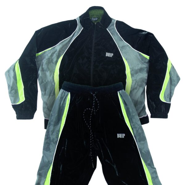 New for 2025/6 ~ Limited Edition Velour Tracksuit in Black & Grey with Neon Green trim with DRIP Logo on jogger top/bottoms. A great and relaxed winter fit that is machine washable and unisex. Velvet/velour fabric give softer feel and anti pill properties which help to ensure a long life for the garment. You can be sure of a high quality fabric with a recommended wash temperature of 30 degrees . An excellent all-year round style choice, allowing you to stay on-brand and fashionable during each respective season.